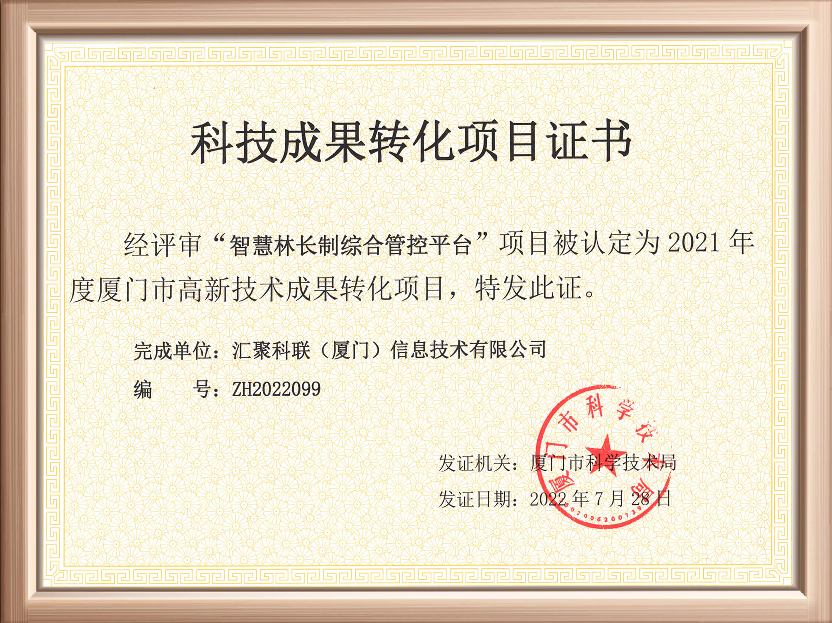 近日,匯聚科聯(lián)收到廈門市科技局頒發(fā)的“科技成果轉(zhuǎn)化項目證書”,公司“智慧林長制綜合管控平臺”經(jīng)過評選,成功被認定為2021年度廈門市高新技術(shù)成果轉(zhuǎn)化項目。